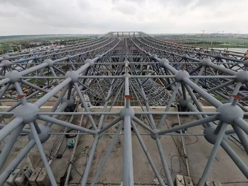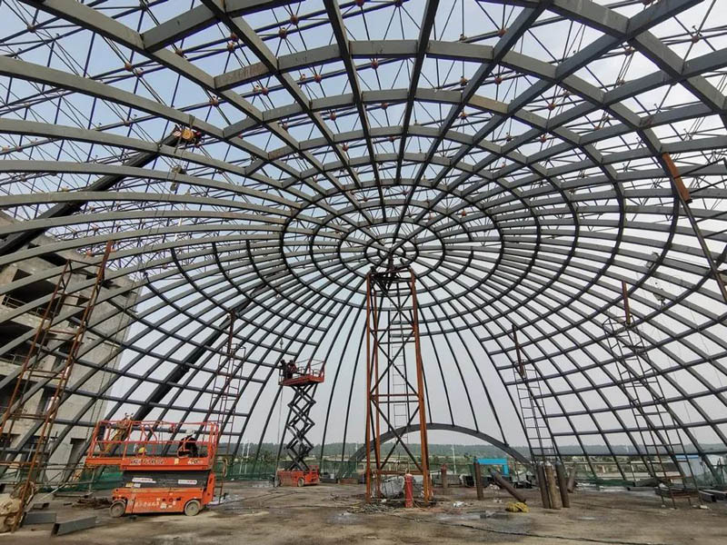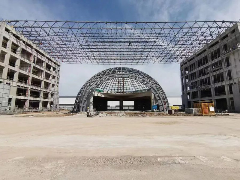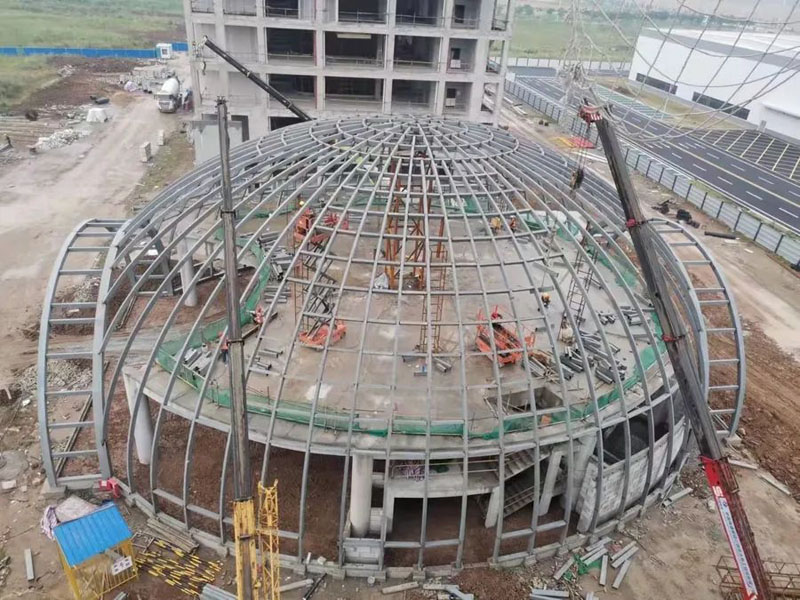 吉利飛行汽車項(xiàng)目汽車展廳鋼結(jié)構(gòu)工程,主體是直徑32米的橢圓形空間桁架結(jié)構(gòu),本工程加工工藝復(fù)雜,構(gòu)件數(shù)量多且雜,車間及現(xiàn)場焊接工作大,主構(gòu)件對接焊接均要求一級(jí)焊縫,施工期間兩臺(tái)全站儀同時(shí)不同角度測量,配合臨時(shí)支撐架現(xiàn)場有序、施工,整體工期45天。